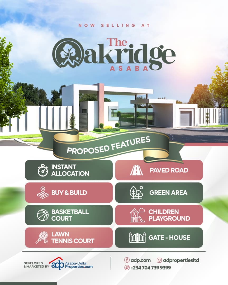 Oakridge Estate is a secure, buy-and-build residential estate located in Ibusa, Asaba, Delta State. The estate is fully cleared, fenced, leveled, and plotted, making it ideal for immediate development.
